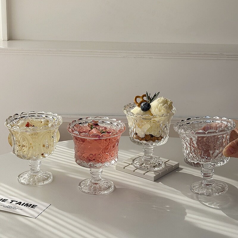 (特)复古浮雕水晶冰淇淋甜品杯欧式家用高脚玻璃杯高颜值饮品杯果汁杯