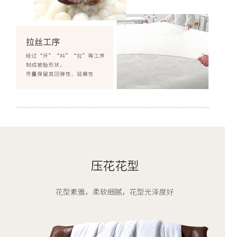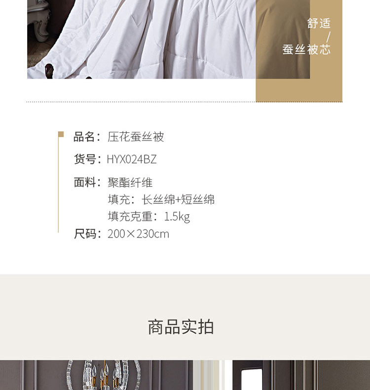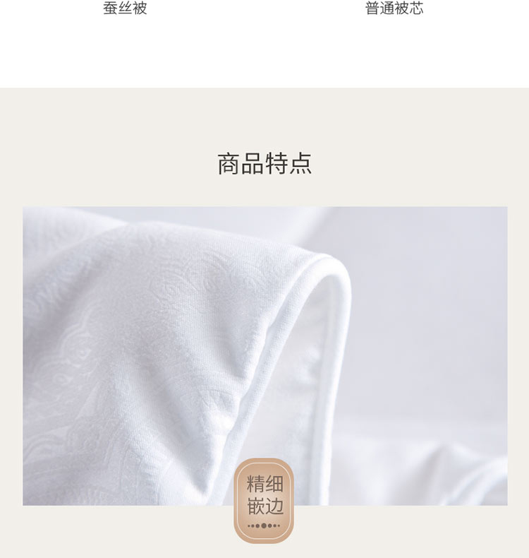 商品名称:恒源祥HYX024BZ商品编号:56643750412商品毛重:4.0kg材质:其他填充物含量:100%尺寸:200*230cm填充物净重:1.5(含)-2.0(不含)kg适用季节:春秋填充物:蚕丝适用人群:成人重量:4.1-5斤蚕丝种类:桑蚕丝制作工艺:手工面料:涤纶(聚酯纤维)蚕丝长度:短丝绵规格:单被