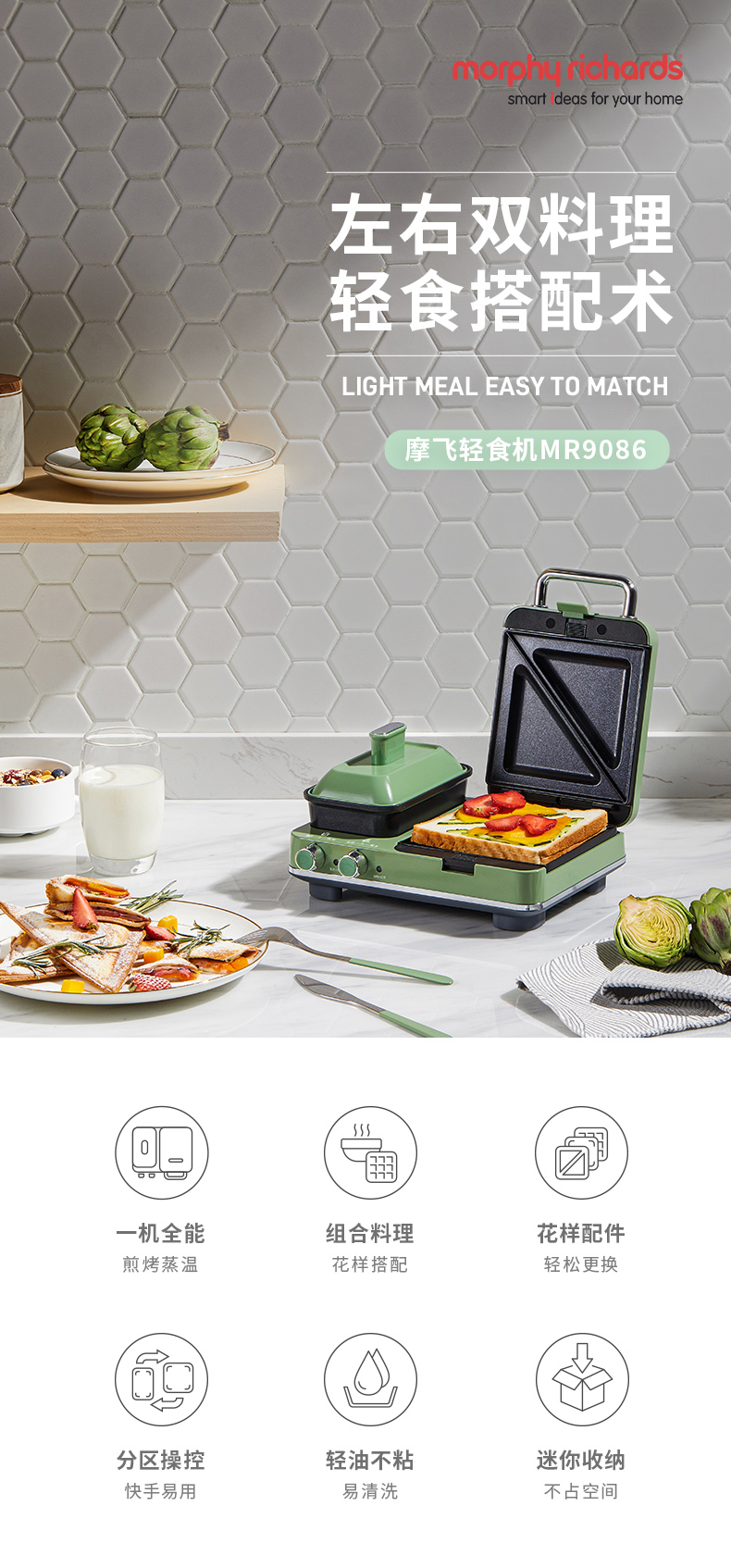 摩飞电器(Morphyrichards)早餐机多功能轻食机家用面包煎烤机电饼铛三明治机华夫饼机MR9086