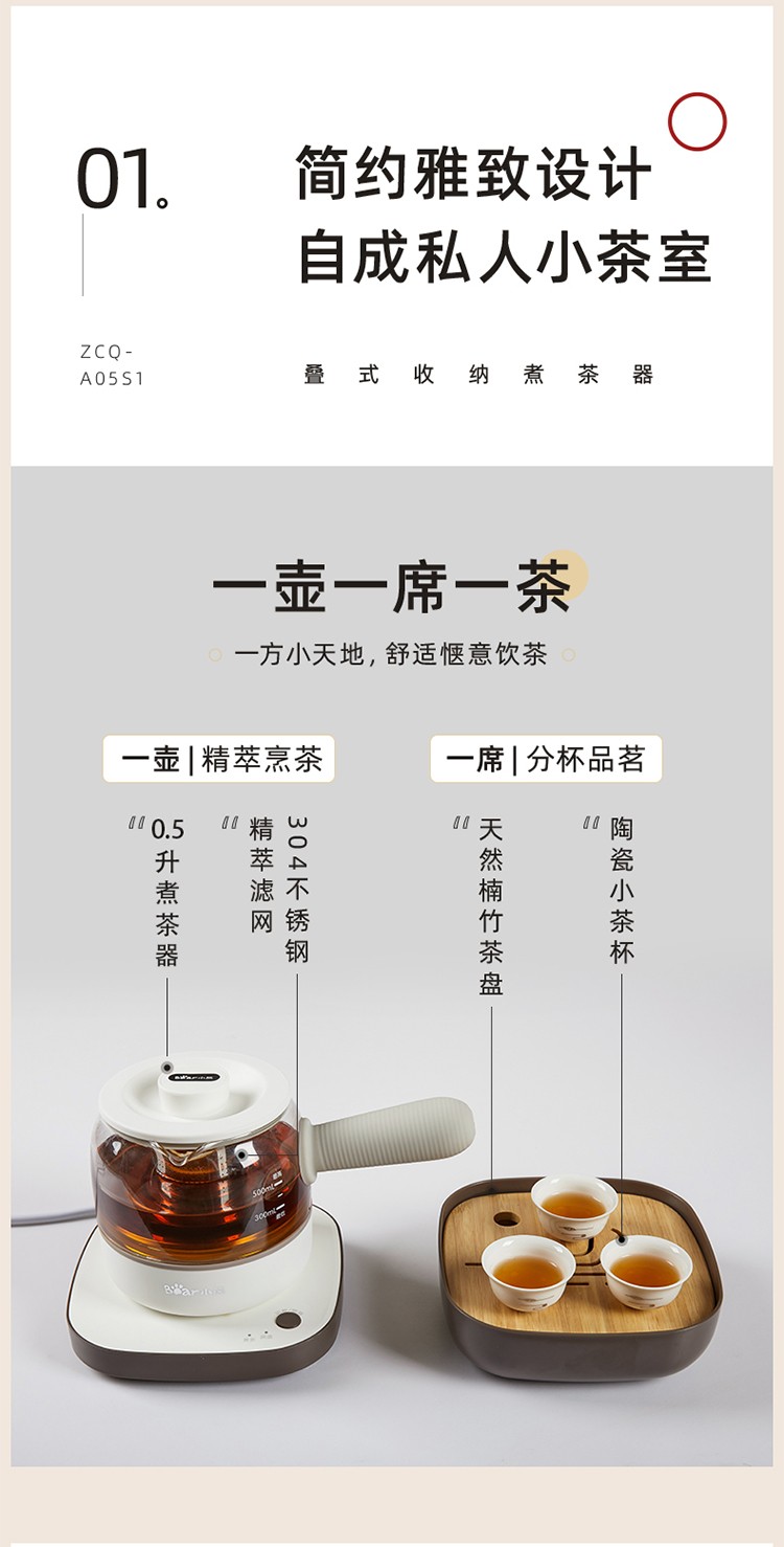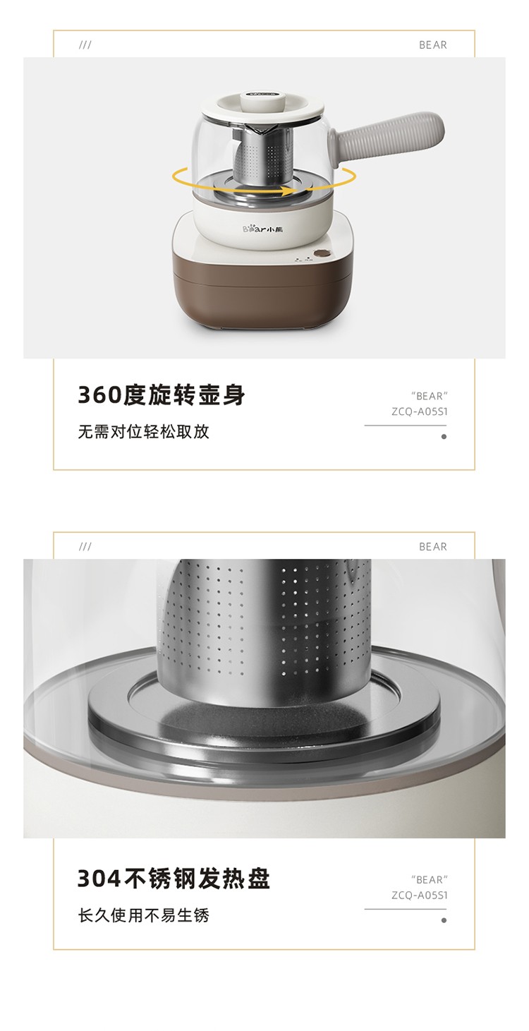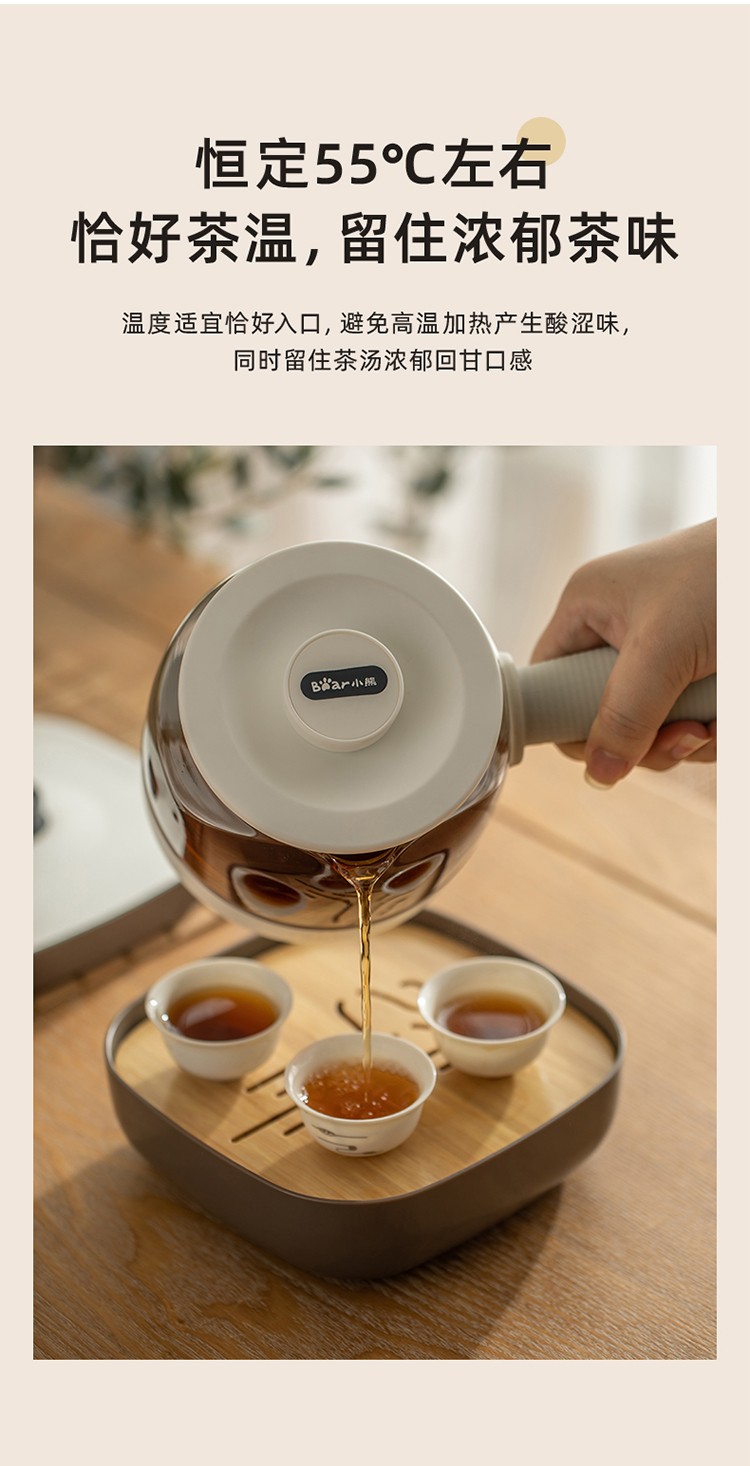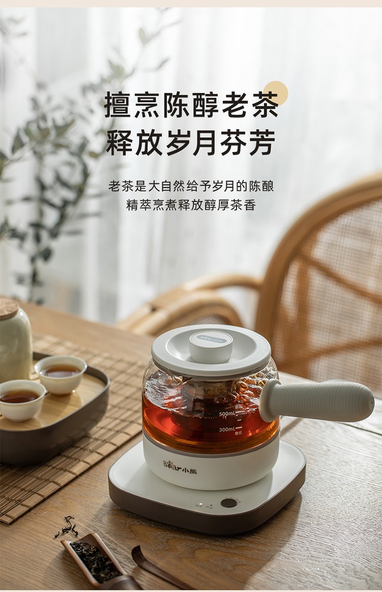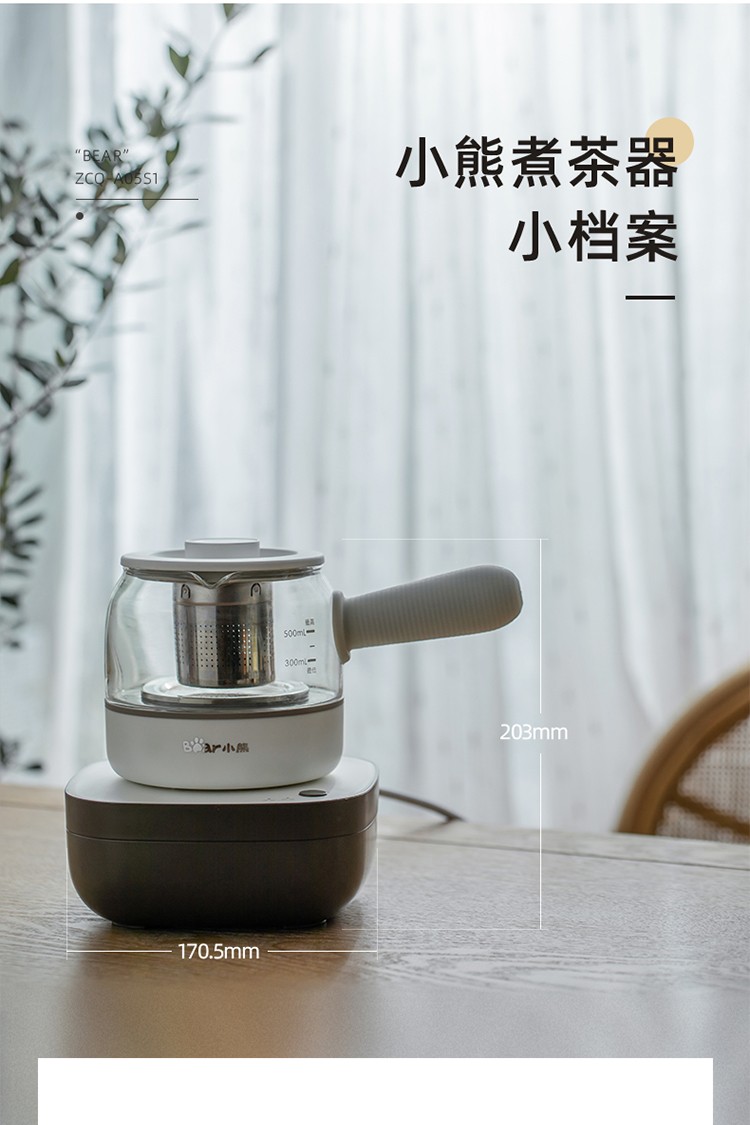 (特)小熊(Bear)煮茶器煮茶壶0.5L蒸汽喷淋式养生壶电水壶热水壶304不锈钢烧水壶花茶壶带茶杯+茶盘 ZCQ-A05S1