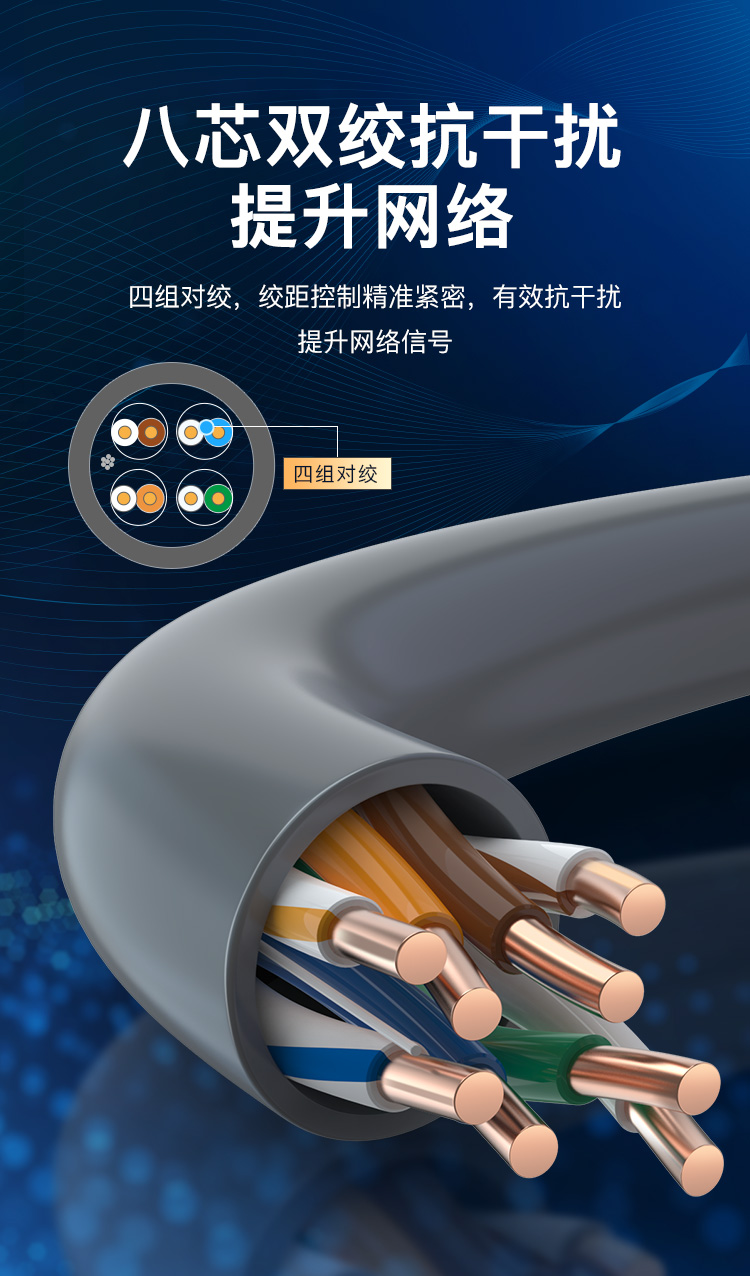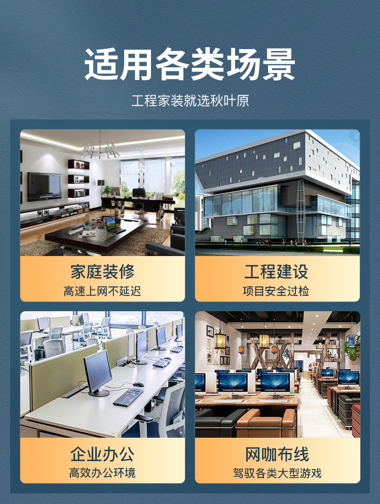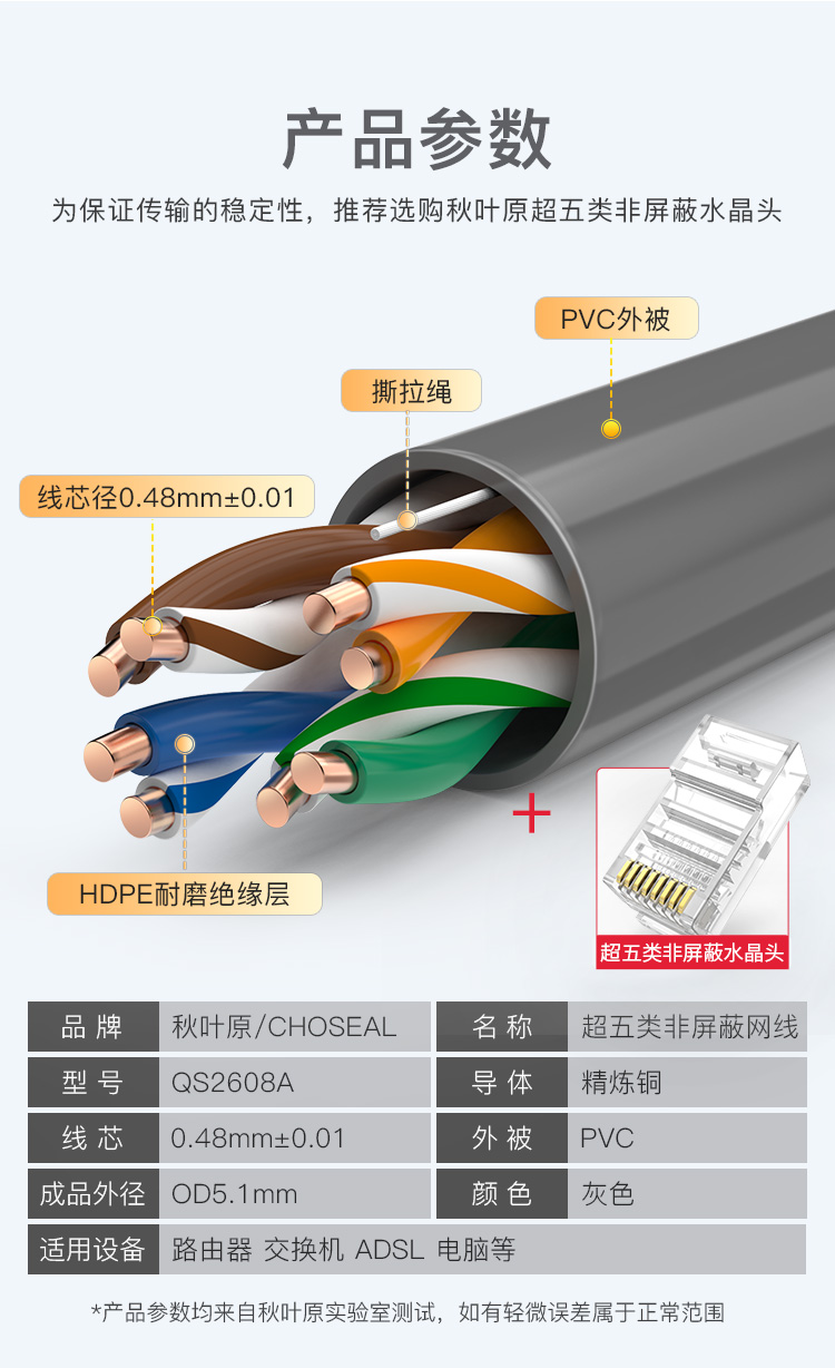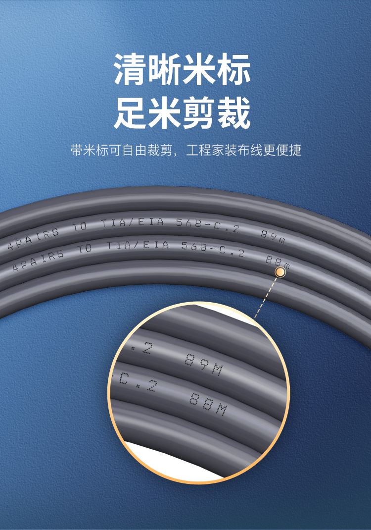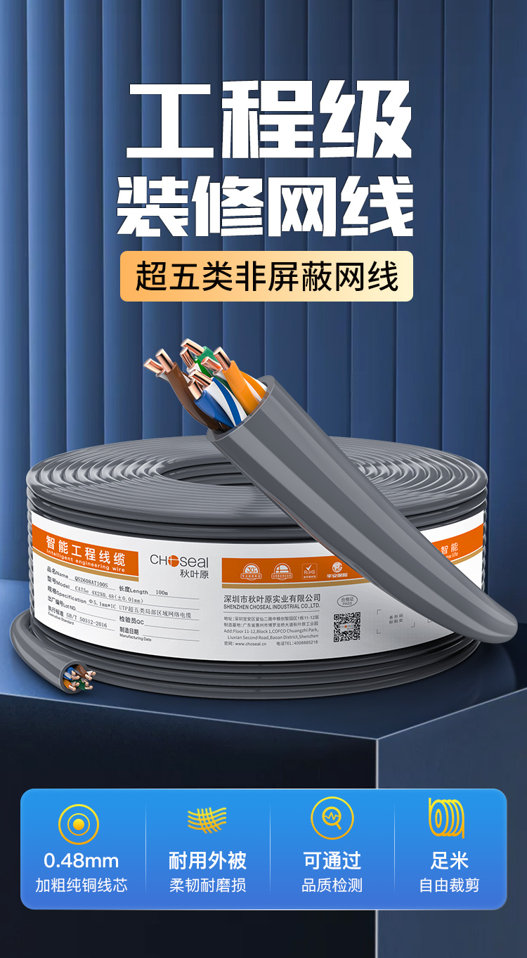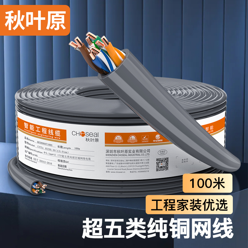 (特)秋叶原(CHOSEAL)原装超五类网线【工程版】CAT5e纯铜线芯综合布线POE供电非屏蔽网络线灰色100米
