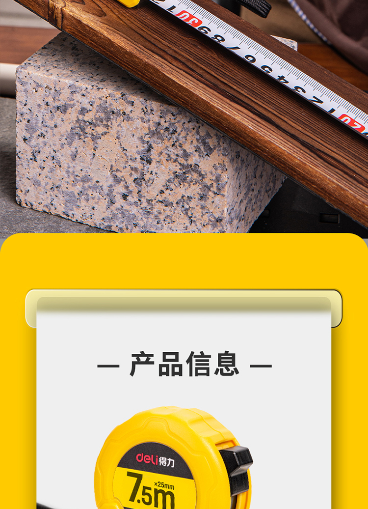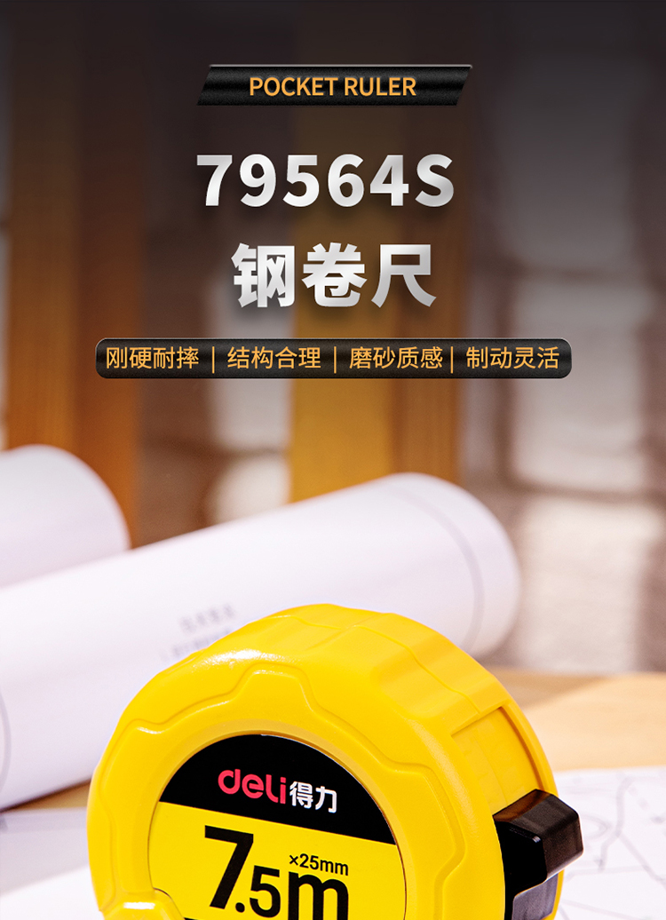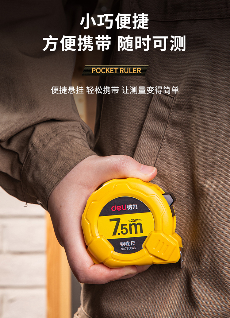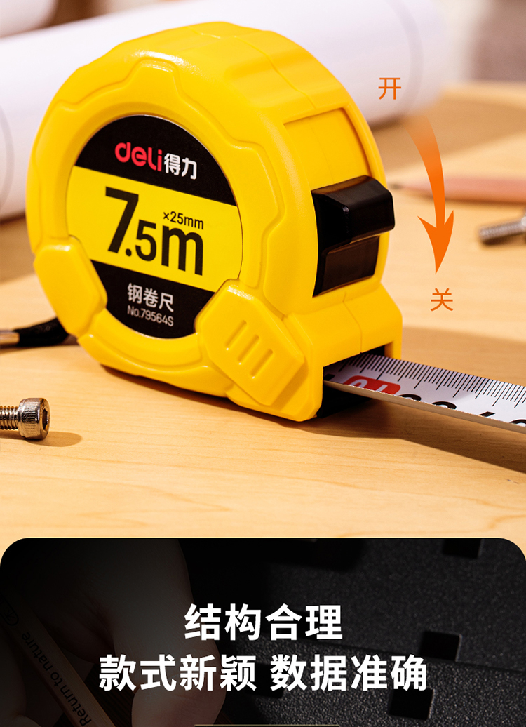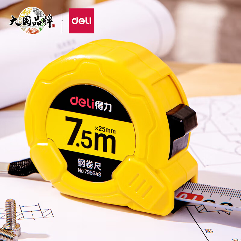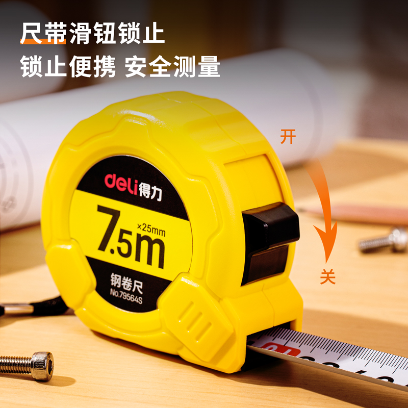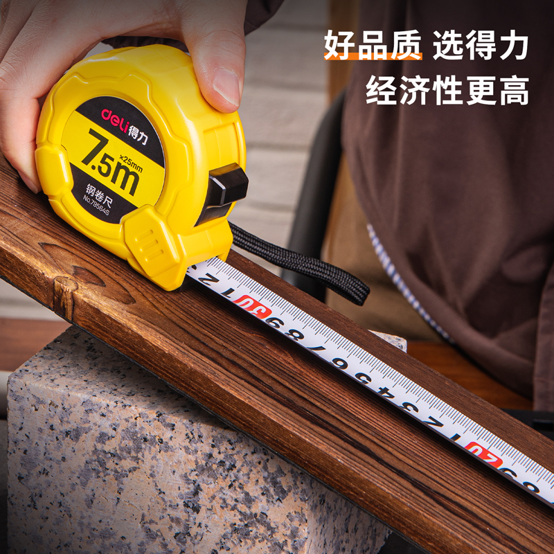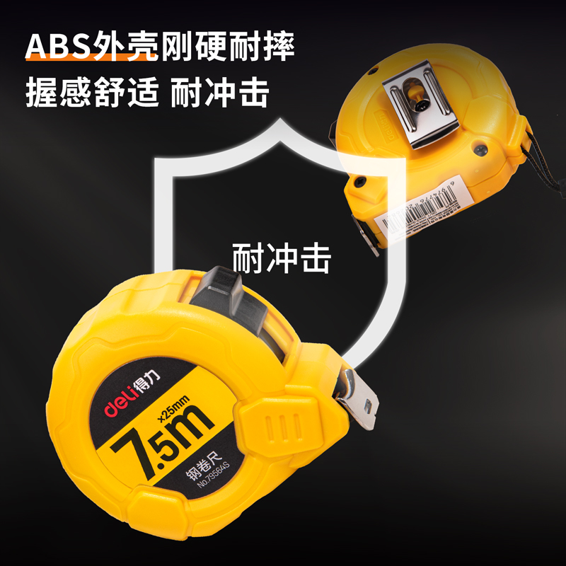(特)得力(deli)7.5m锁定功能钢卷尺 精准测量便携尺子 黄色 79564S