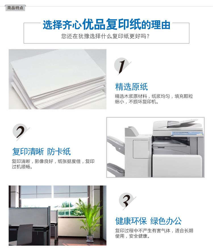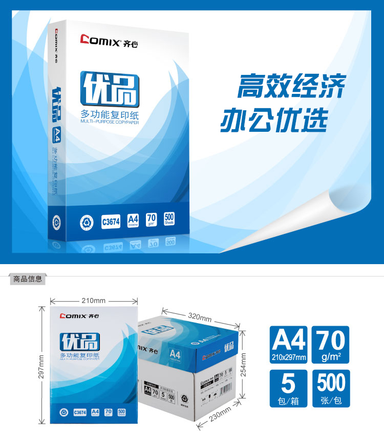 (特)齐心优品A4复印纸70g打印纸 500张/包 办公用a4纸整箱5包 C3674-5