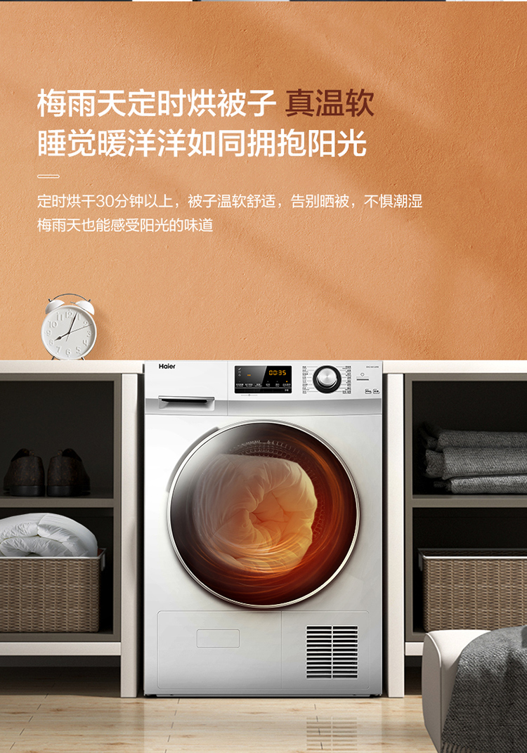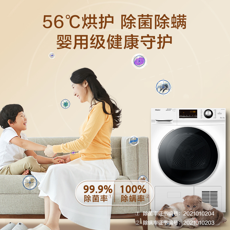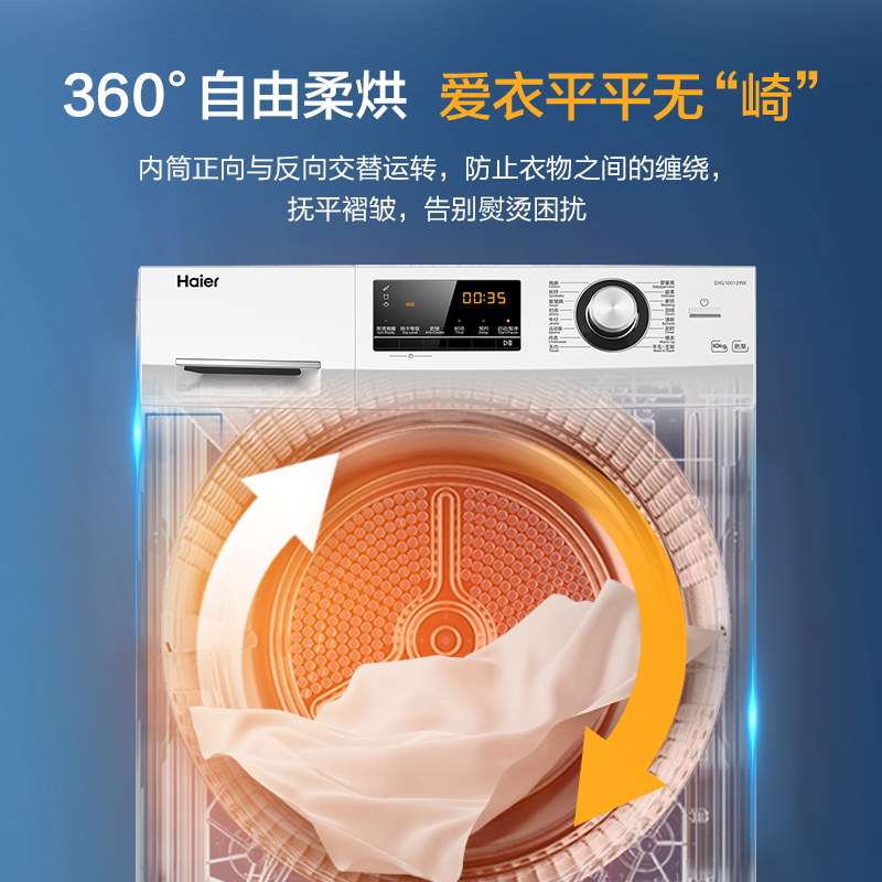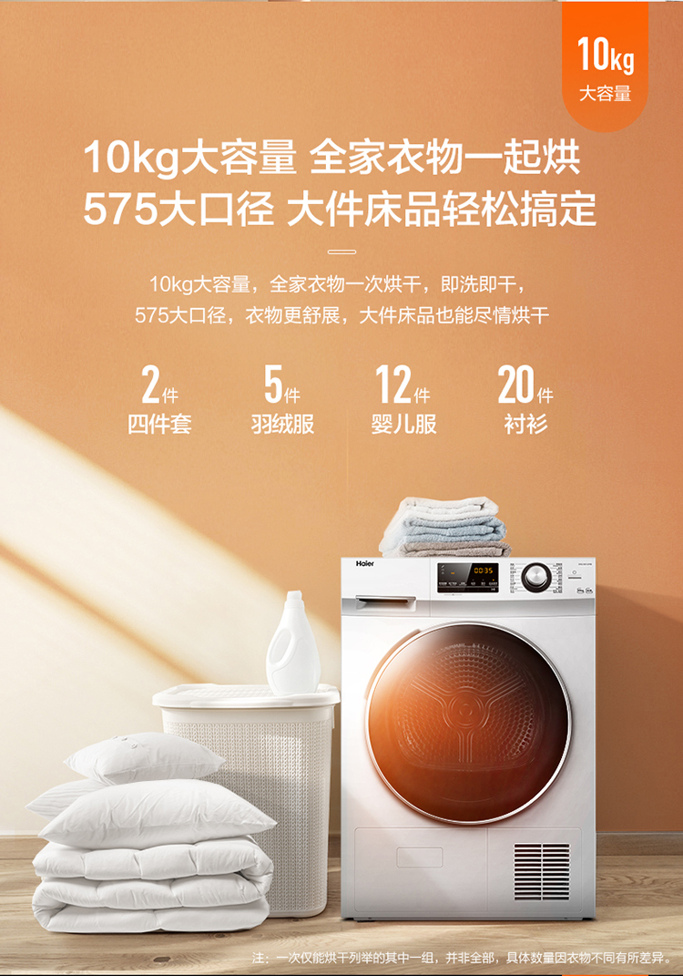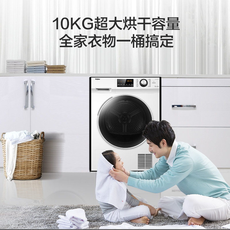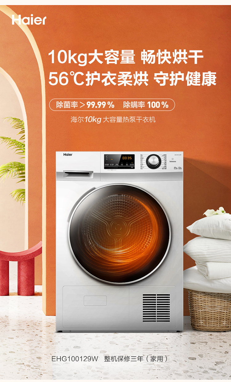 (特)海尔(Haier)10公斤热泵类烘干机家用99.99%除菌除潮祛除宠物毛发衣物干衣机烘衣机全自动滚筒 129W