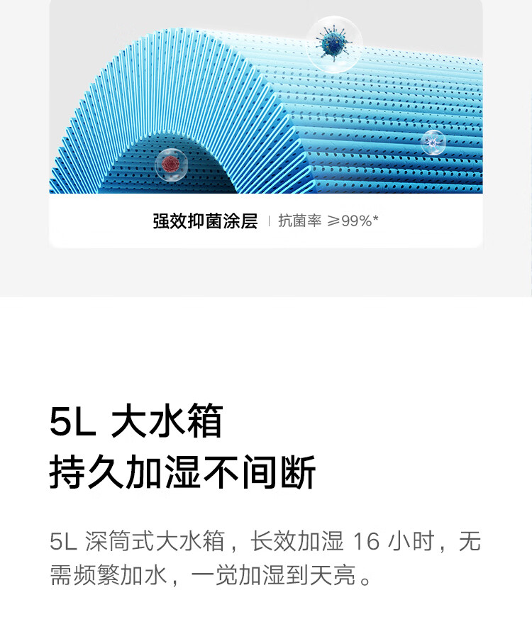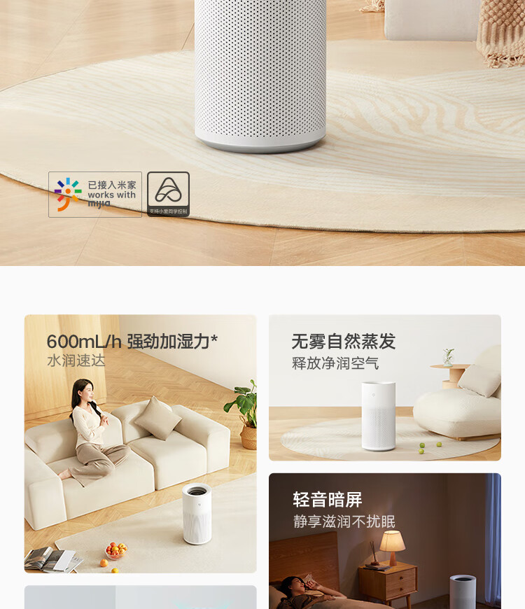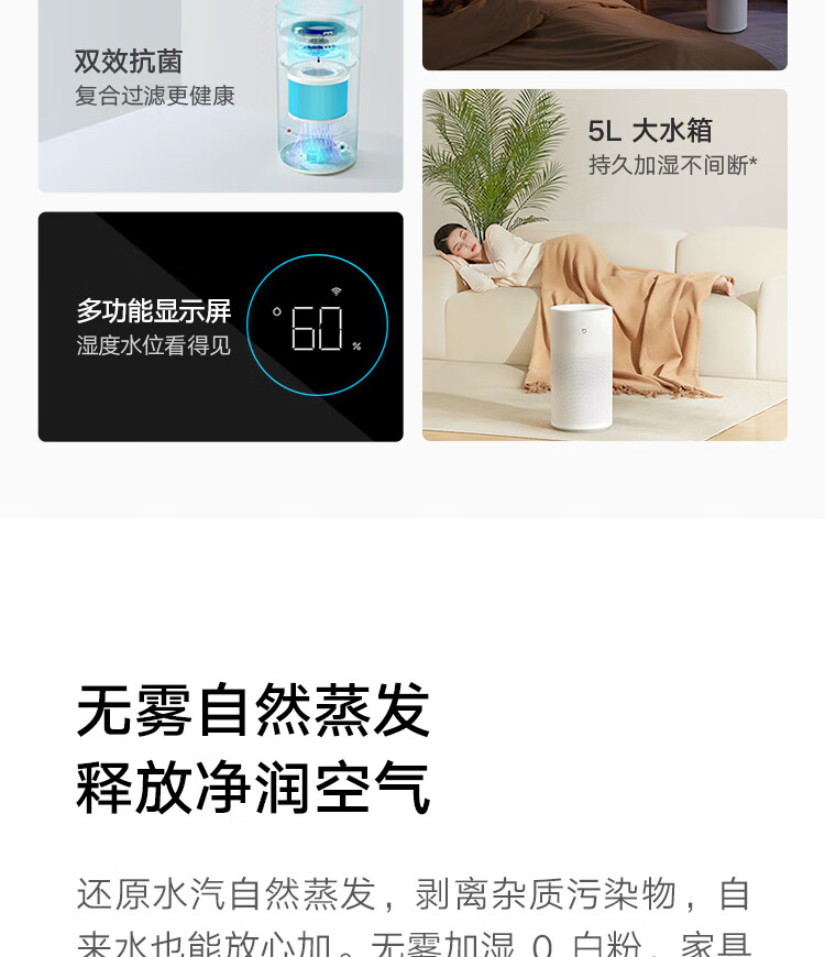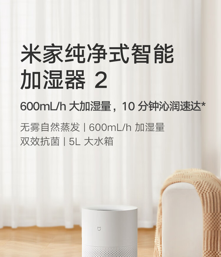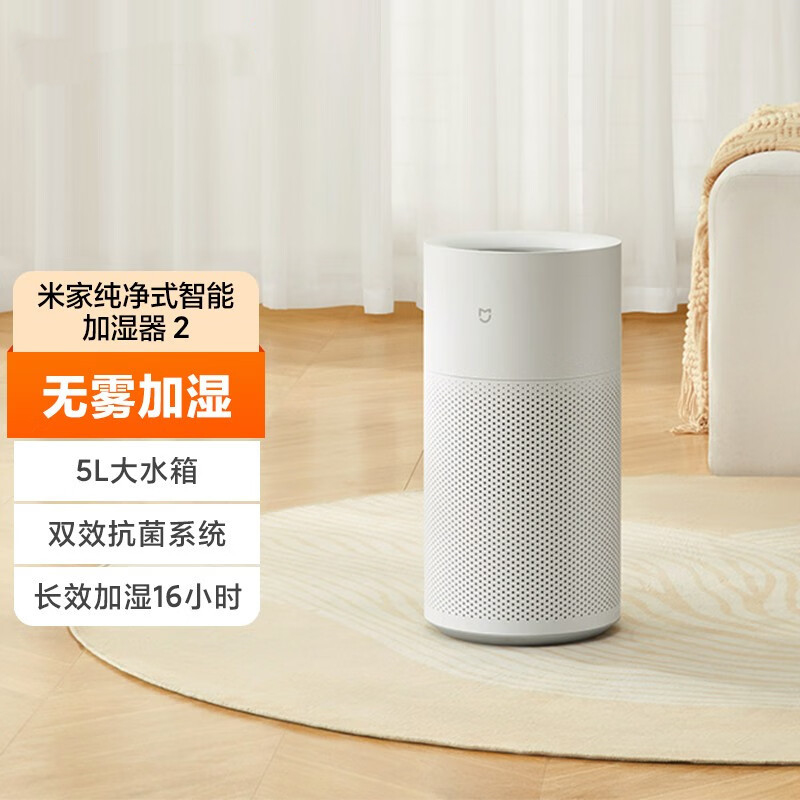(特)米家 小米纯净式智能加湿器2 无雾加湿器 轻音 卧室家用办公室 自然蒸发 5L大水箱上加水智能数显