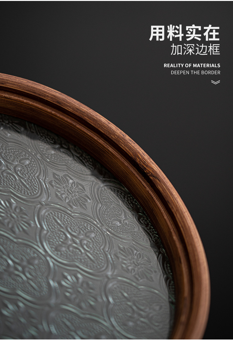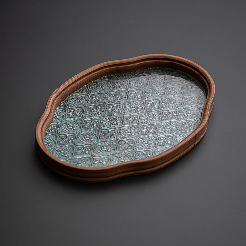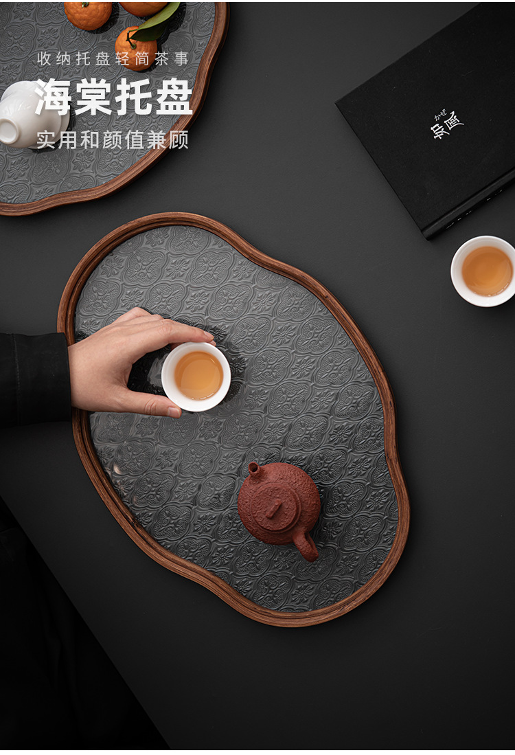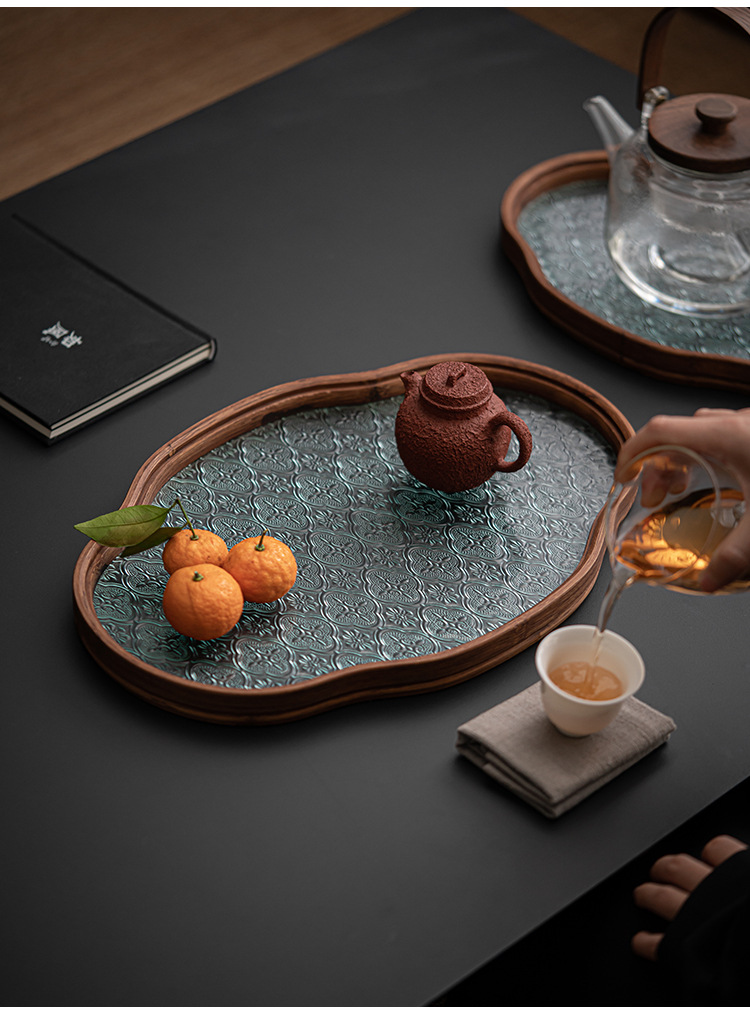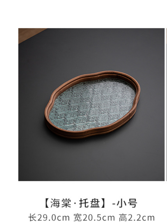 日式海棠花玻璃茶托盘复古竹制茶盘简约家用茶室水果点心盘收纳盘