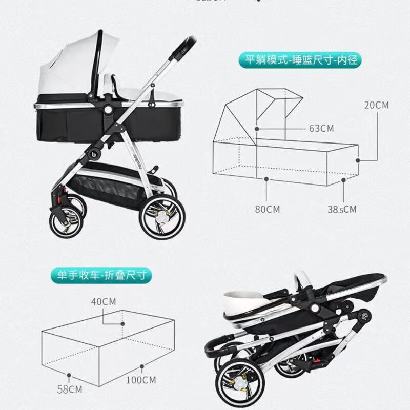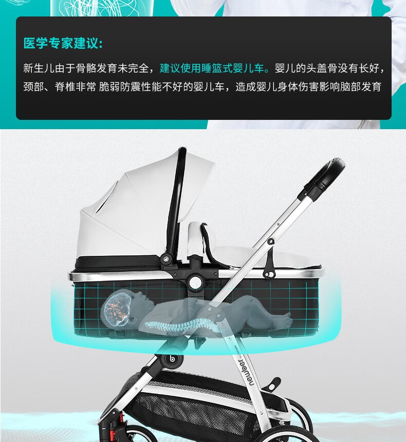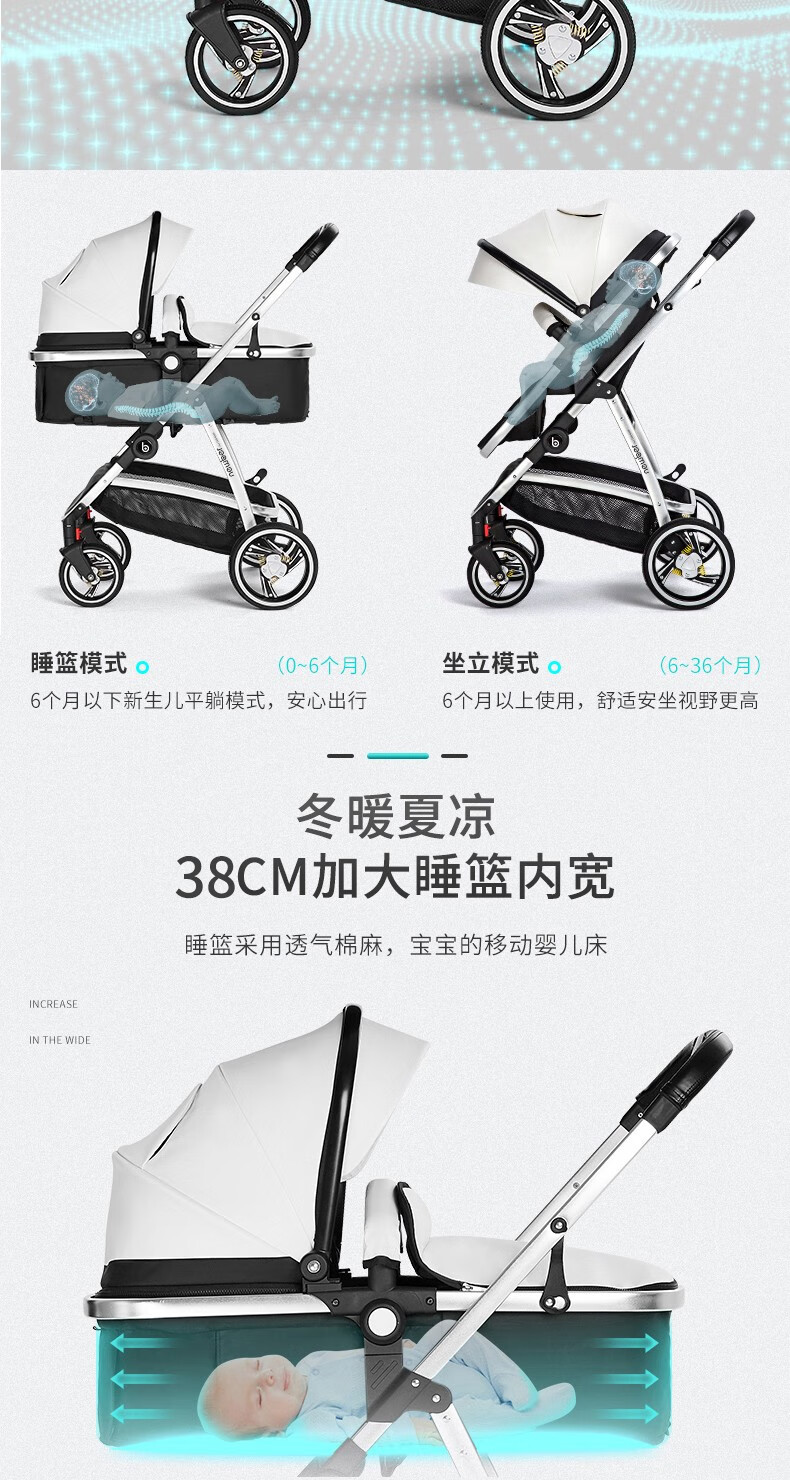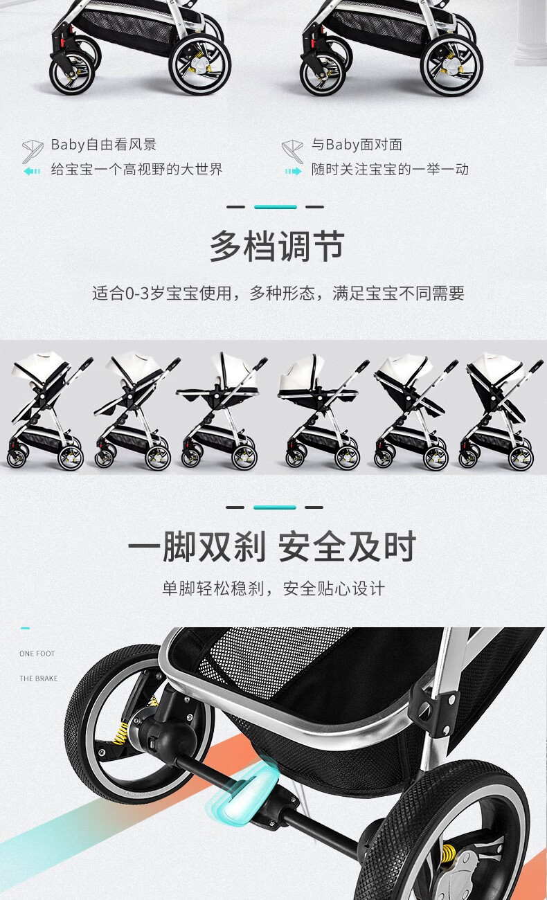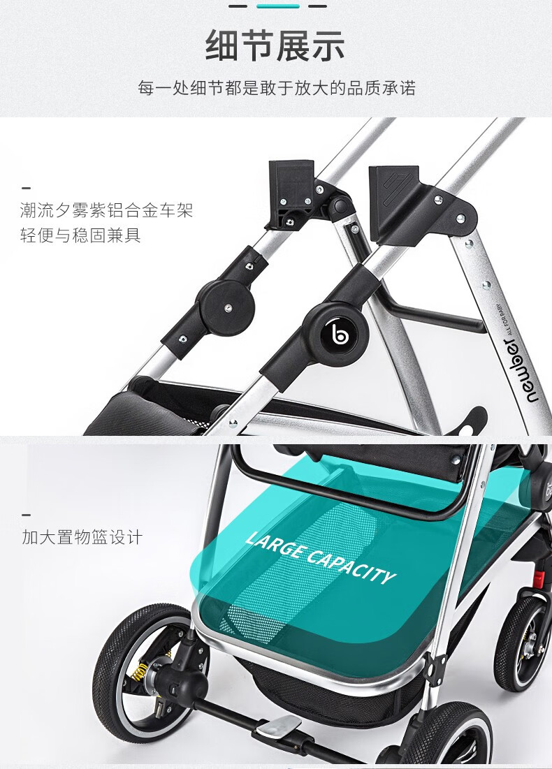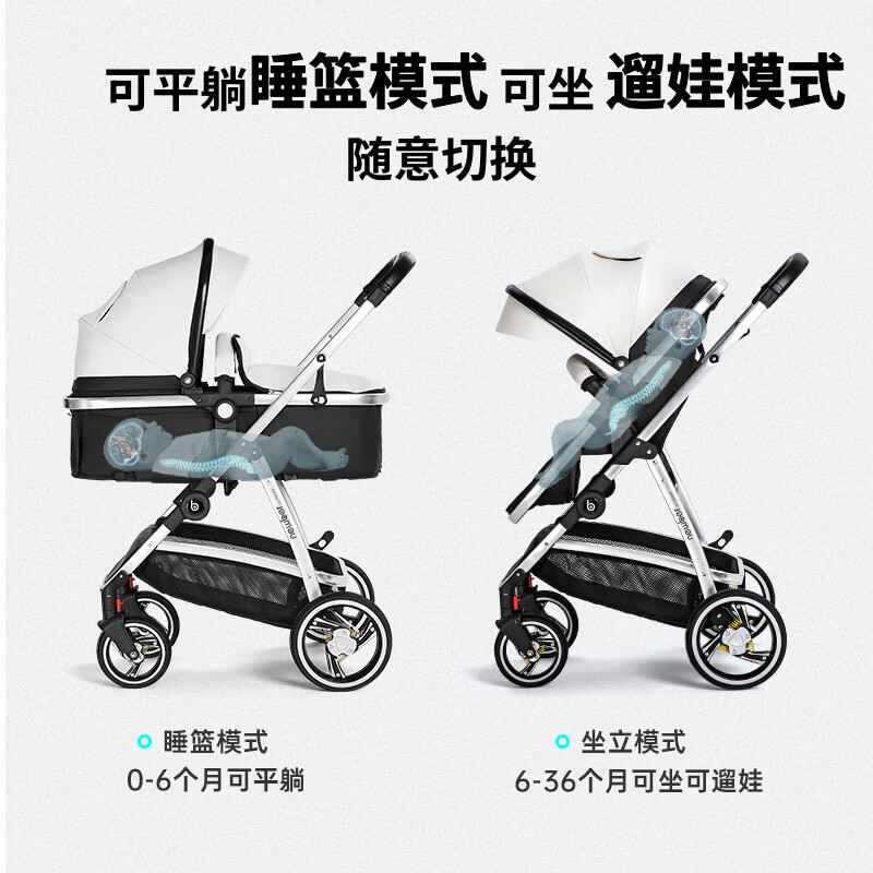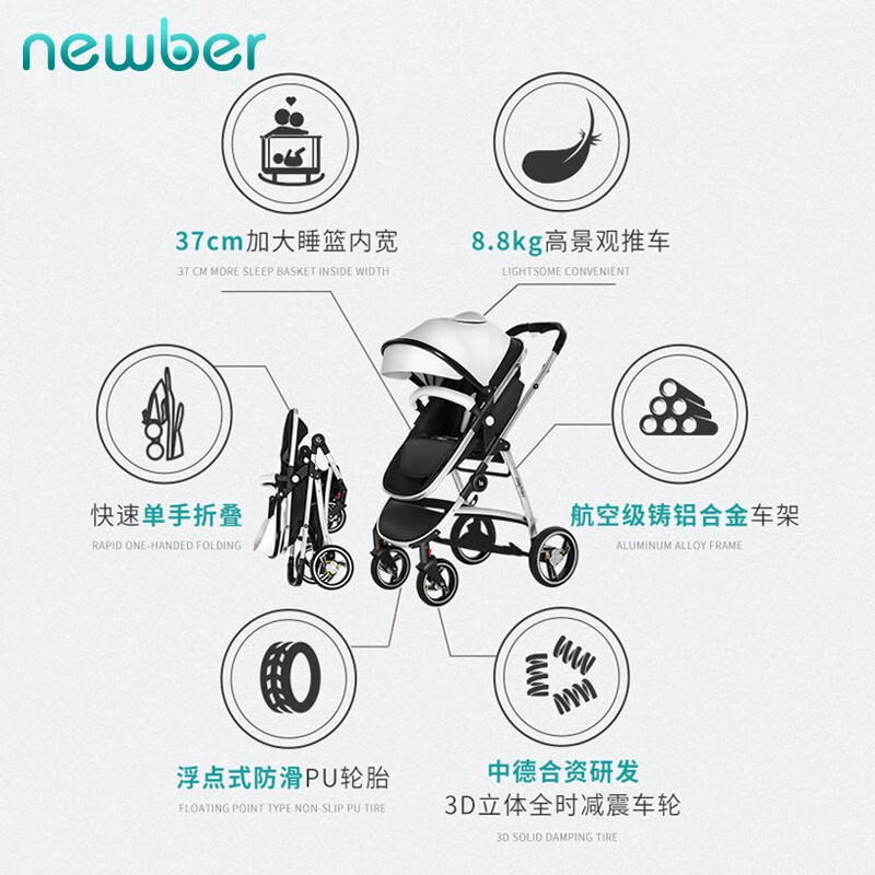 纽贝耳newber婴儿车0-3岁用婴儿推车可坐可躺可折叠高景观双向可调 黑白【推车+蚊帐】808A