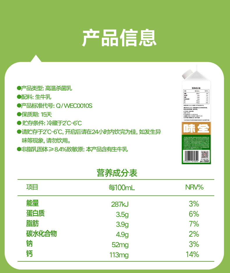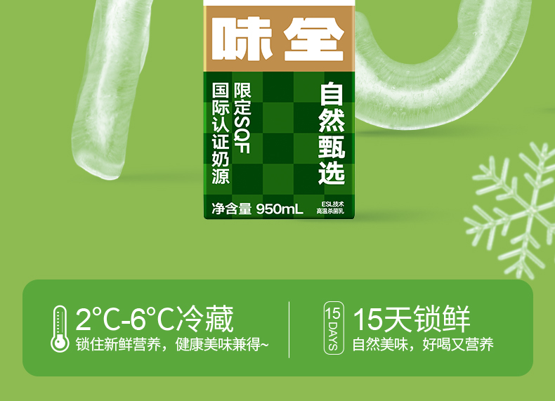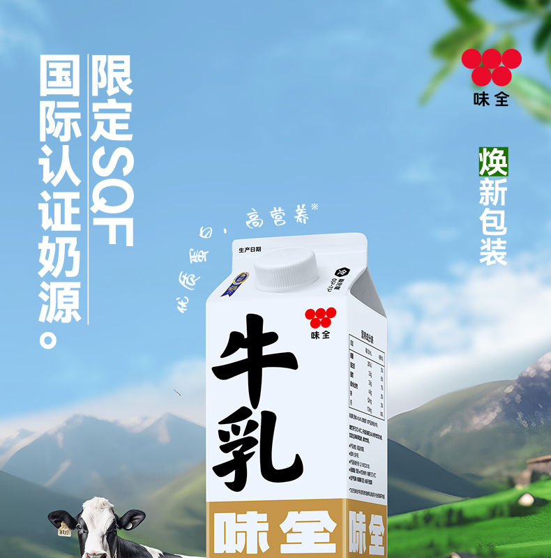 (特)味全冷藏牛乳950ml自然甄选味全乳品鲜牛奶鲜牛乳