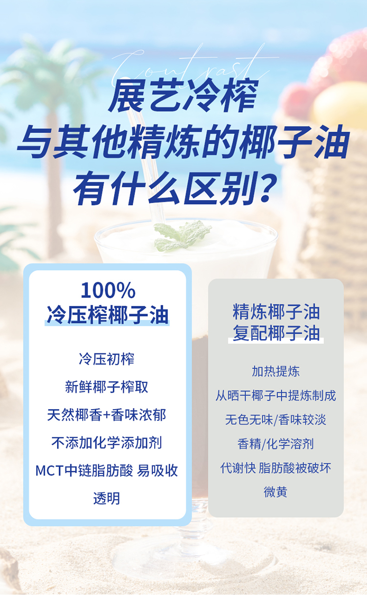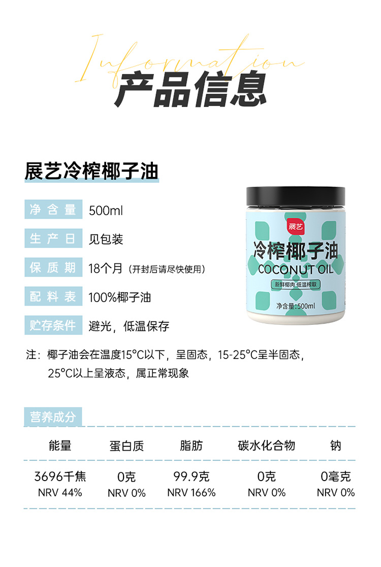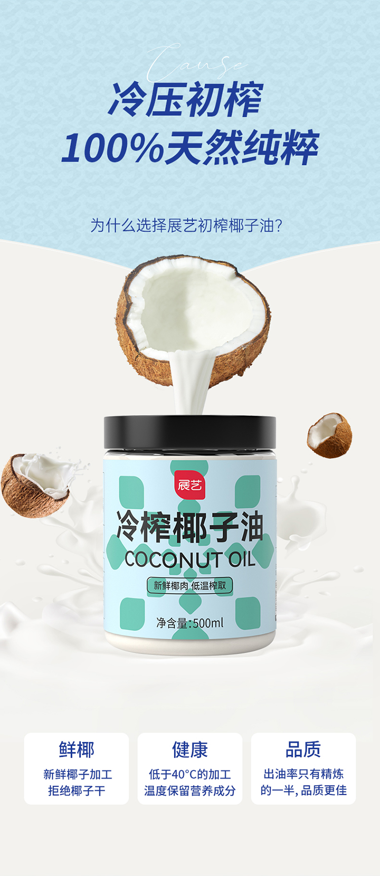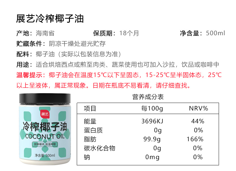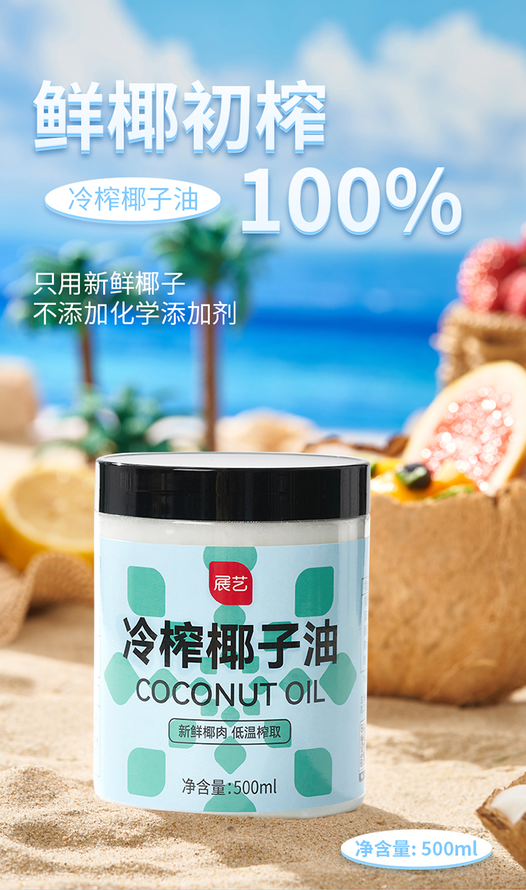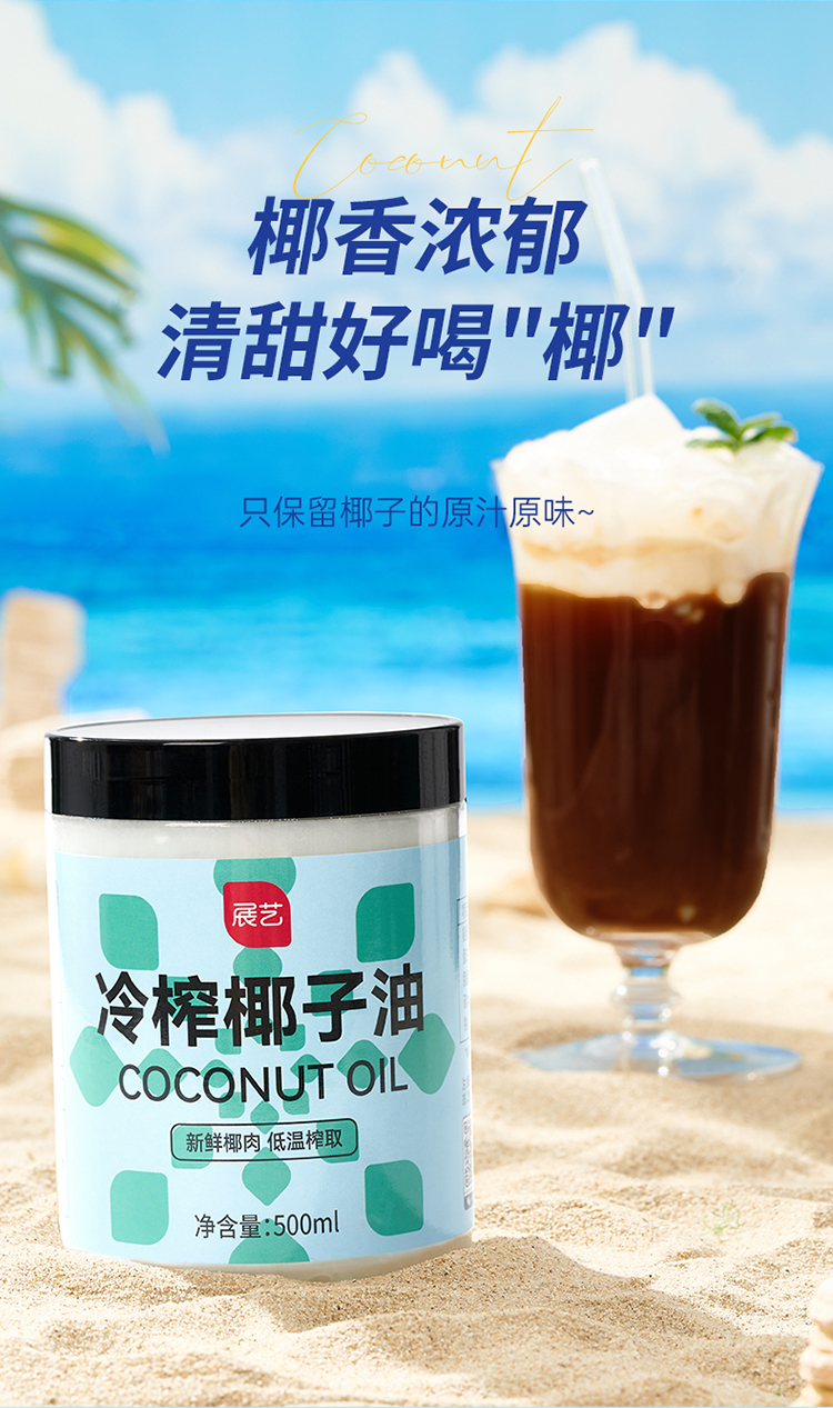 (特)展艺冷榨椰子油500ml海南纯食用初榨家用炒菜煎蛋烘焙蛋糕专用