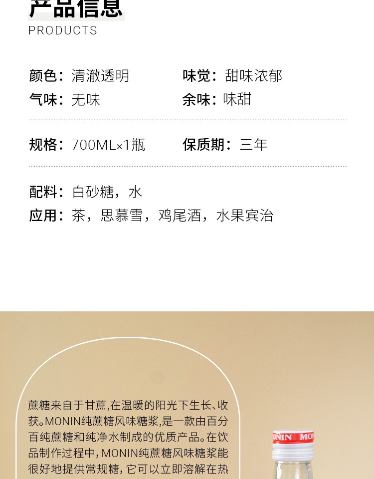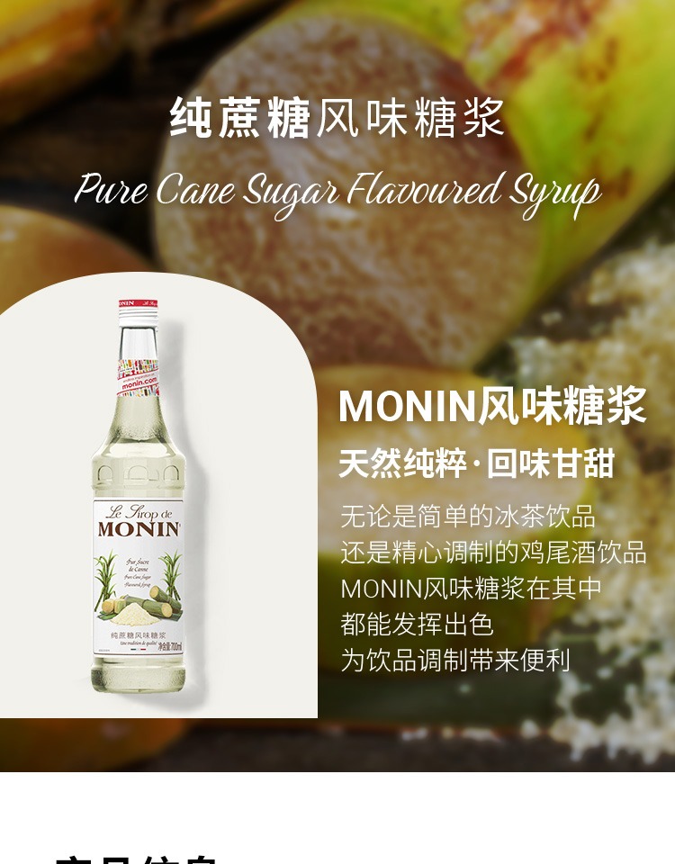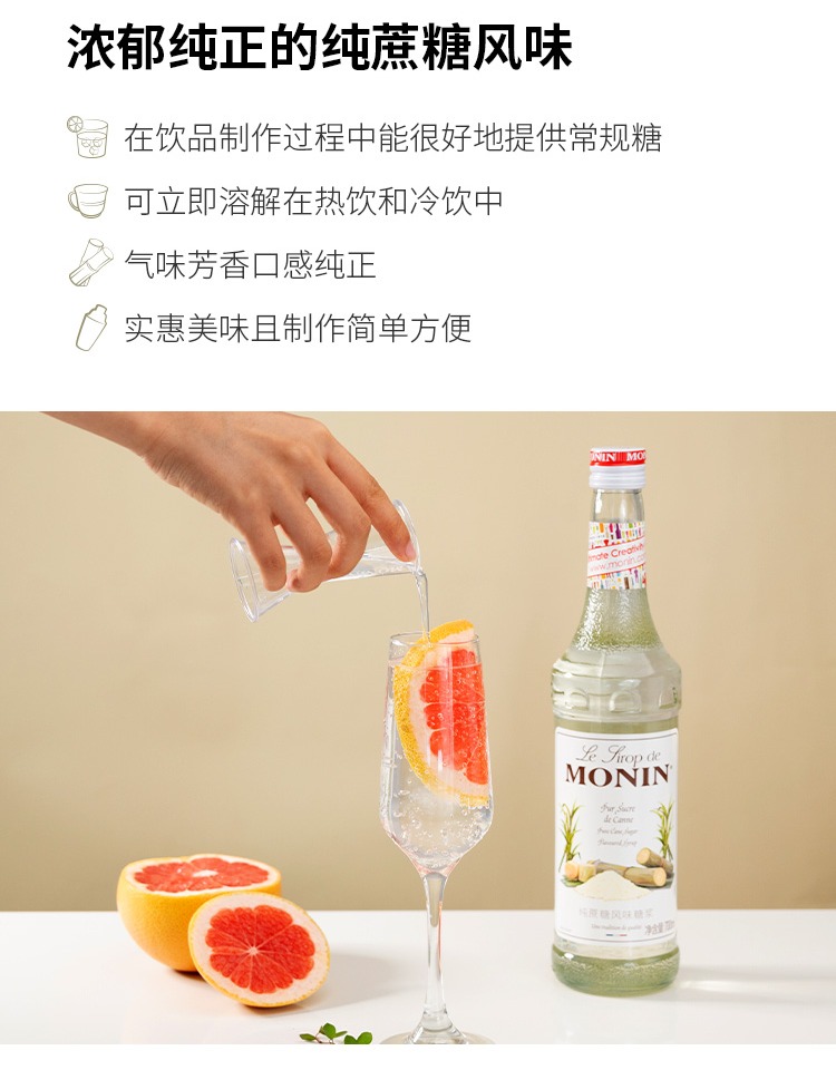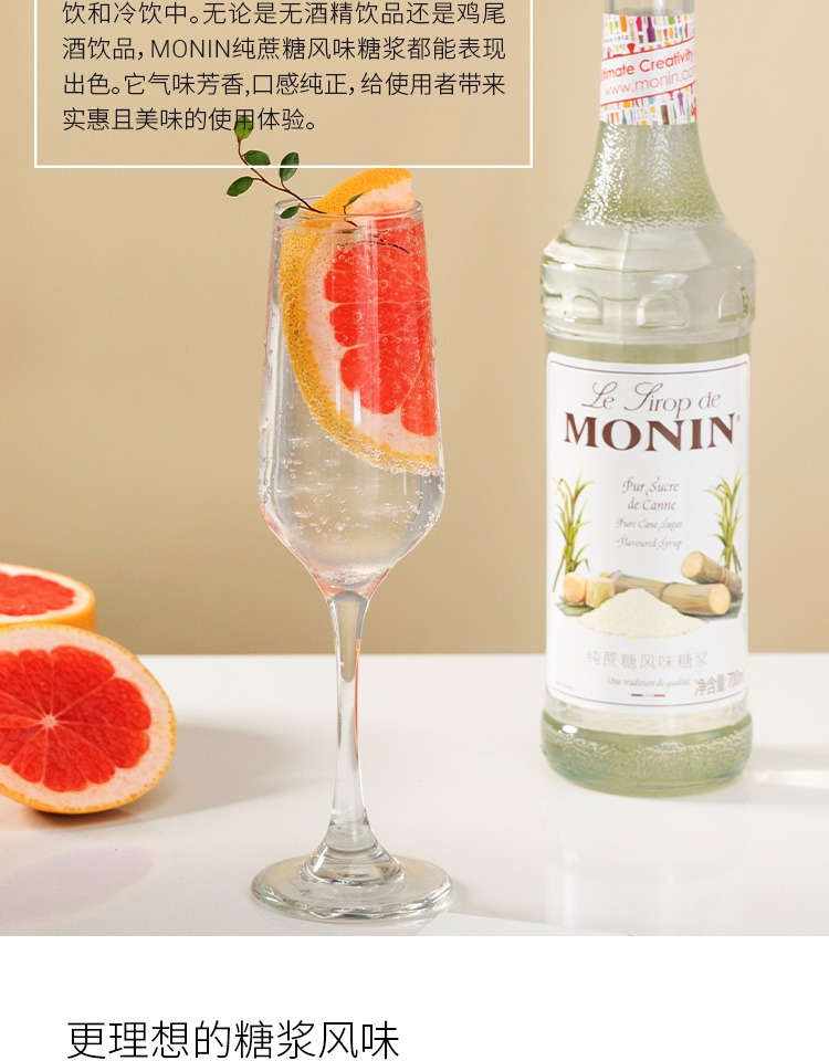 (特)莫林MONIN纯蔗糖风味糖浆玻璃瓶700ml咖啡鸡尾酒调酒糖浆果汁饮料