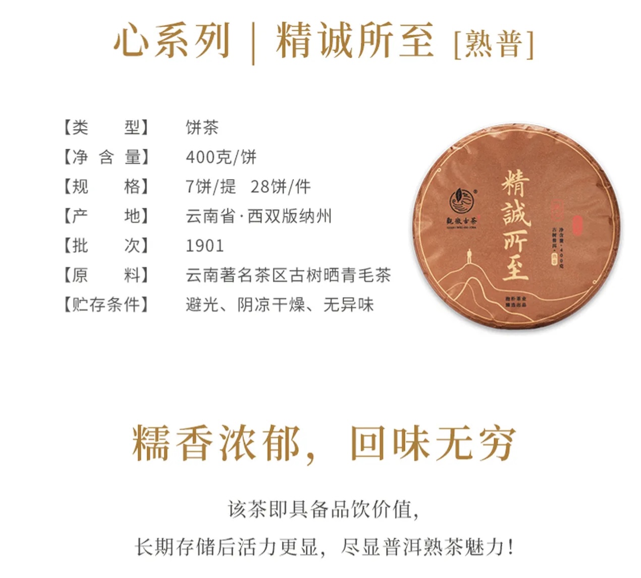 (特)观微古茶精诚所至 熟茶 臻选云南名山古树7年陈熟茶普洱 400克饼