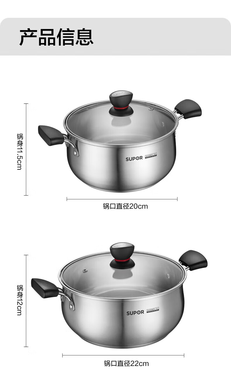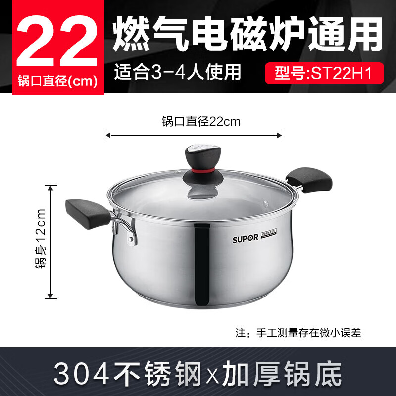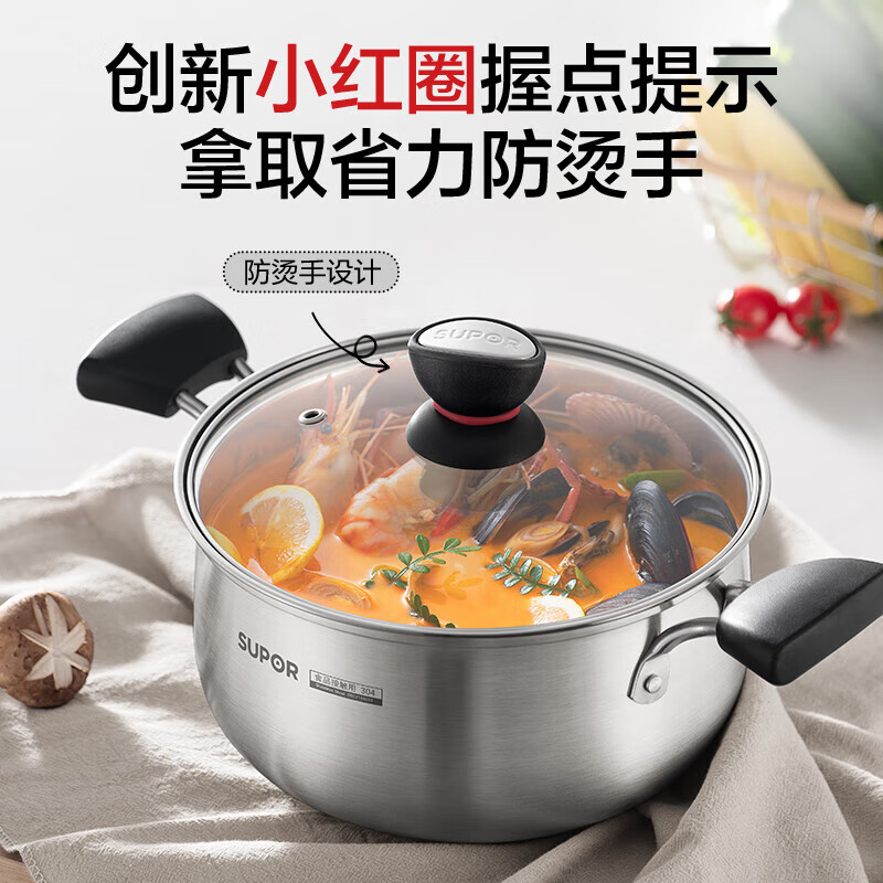 苏泊尔小红圈304不锈钢汤锅奶锅22cm煮面锅复底通用ST22H1