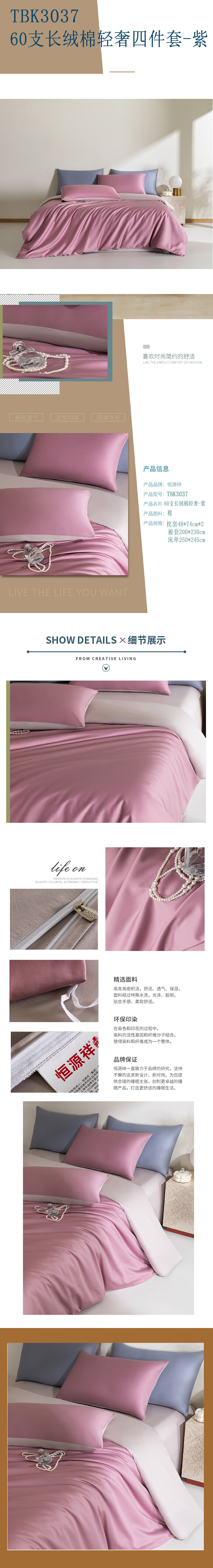 恒源祥TBK3037 60支长绒棉轻奢四件套-紫