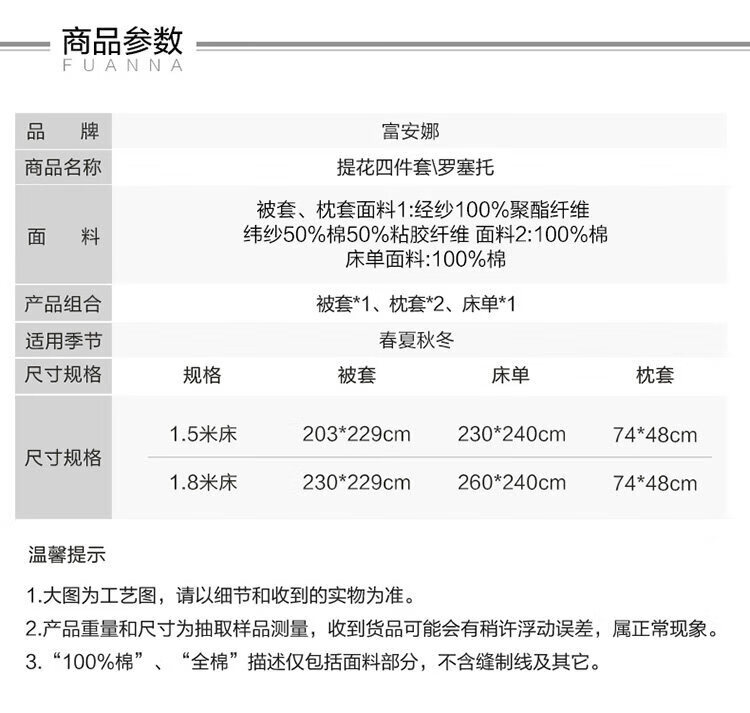 富安娜 素提四件套-罗塞托(A面涤竹棉提花+B面纯棉) 1.5m床[适用