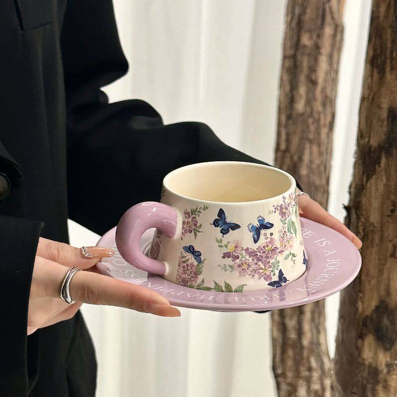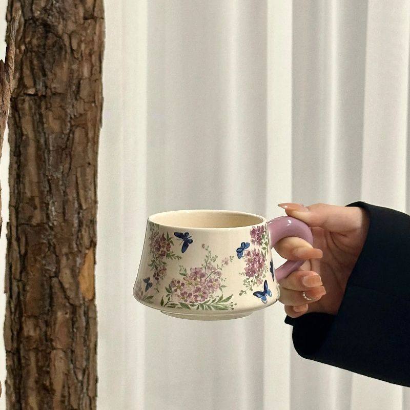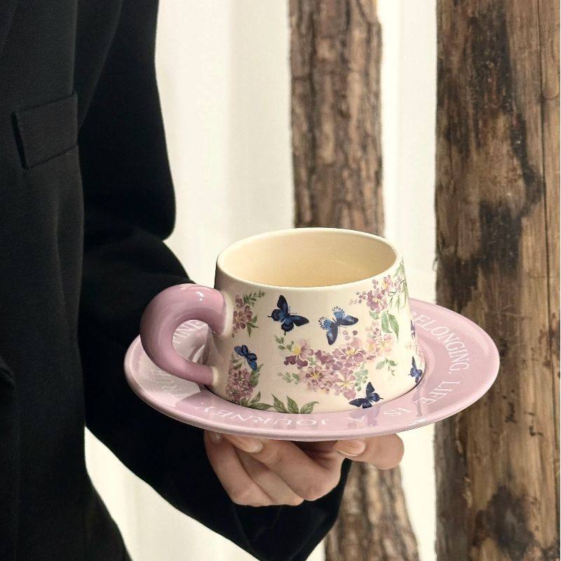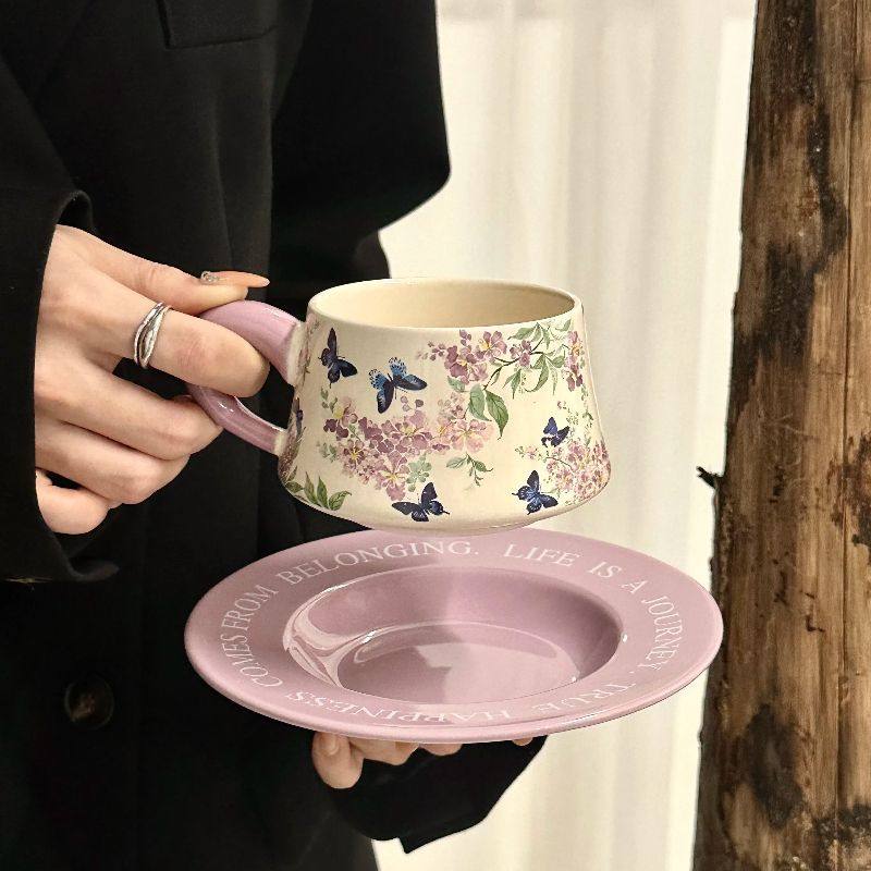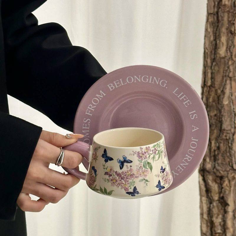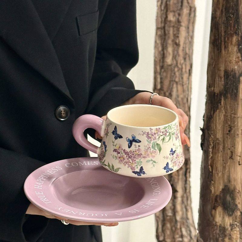 (特)复古陶瓷杯碟紫薇花油画般咖啡杯碟套装下午茶拿铁马克杯伴手礼盒